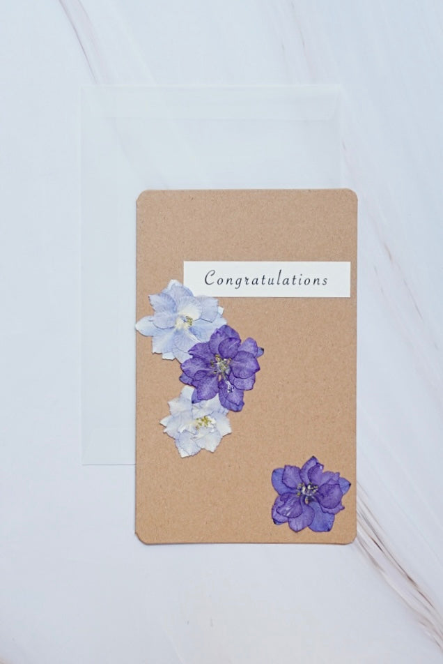 Bring the beauty of nature into every message with this handmade greeting card adorned with real pressed blue larkspur flowers. Known for symbolizing dignity, sincerity, and refined grace, each delicate bloom is carefully hand-pressed and placed by hand, creating a naturally elegant design that is truly one of a kind.
